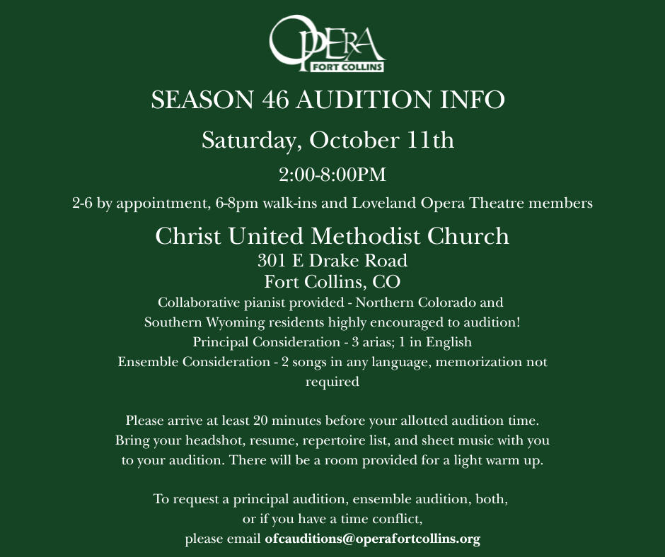 Audition Info for Season 46: Bringing Opera to YOU: https://www.facebook.com/OperaFortCollins/posts/pfbid02J4CziiZqLeKvqqZvsCRBSJT1wjg3ExDm2V9AhP2Mrsfg2JNYTf7MrbdK8riGYrgCl
